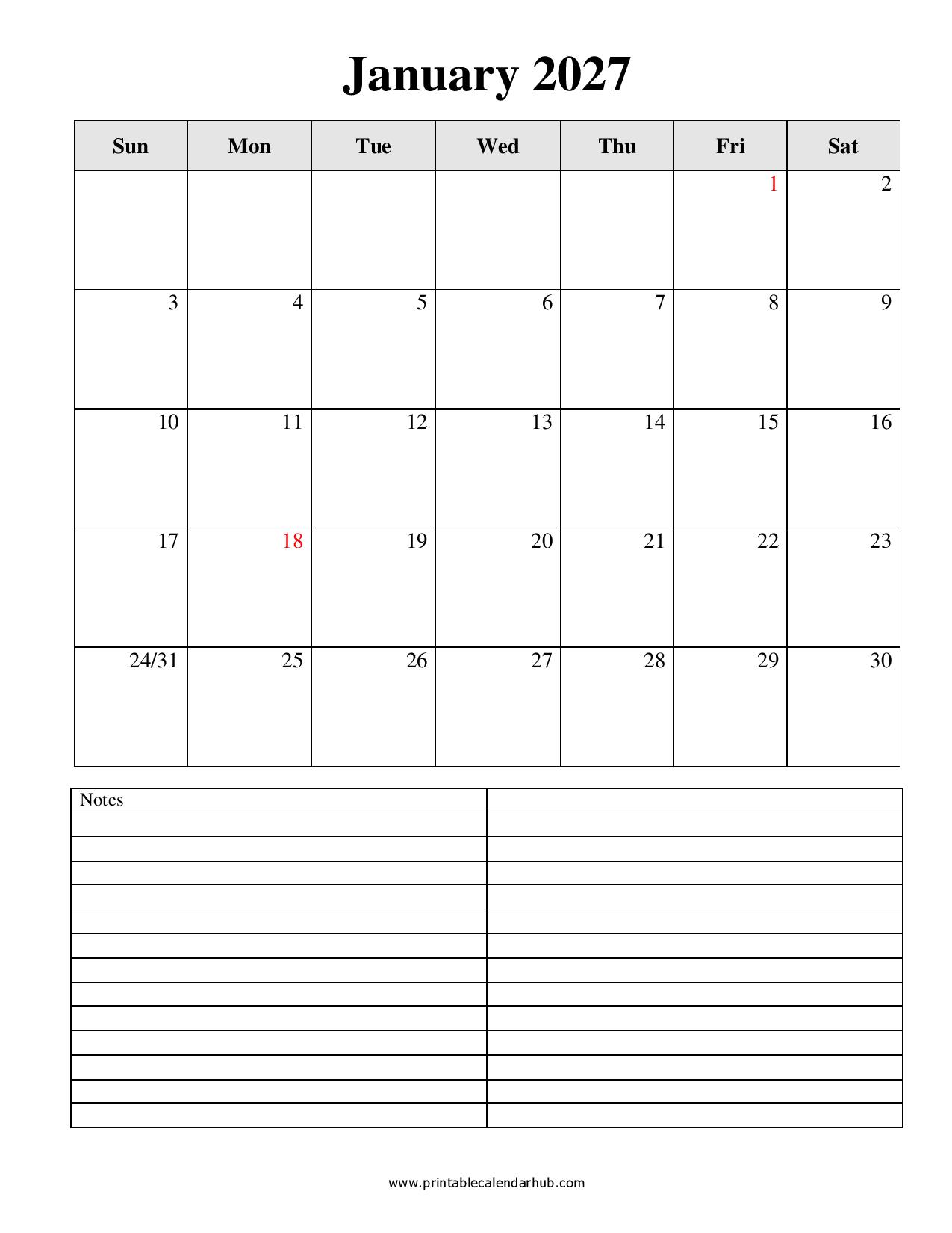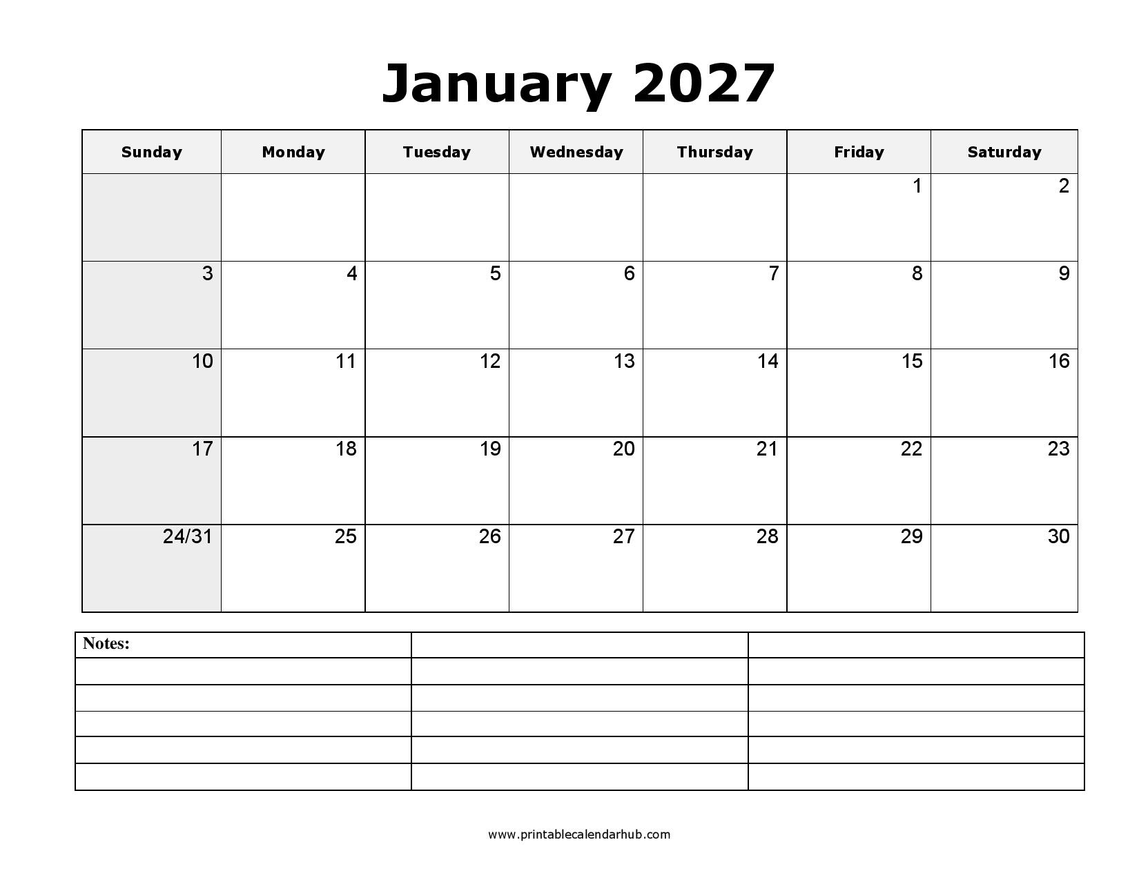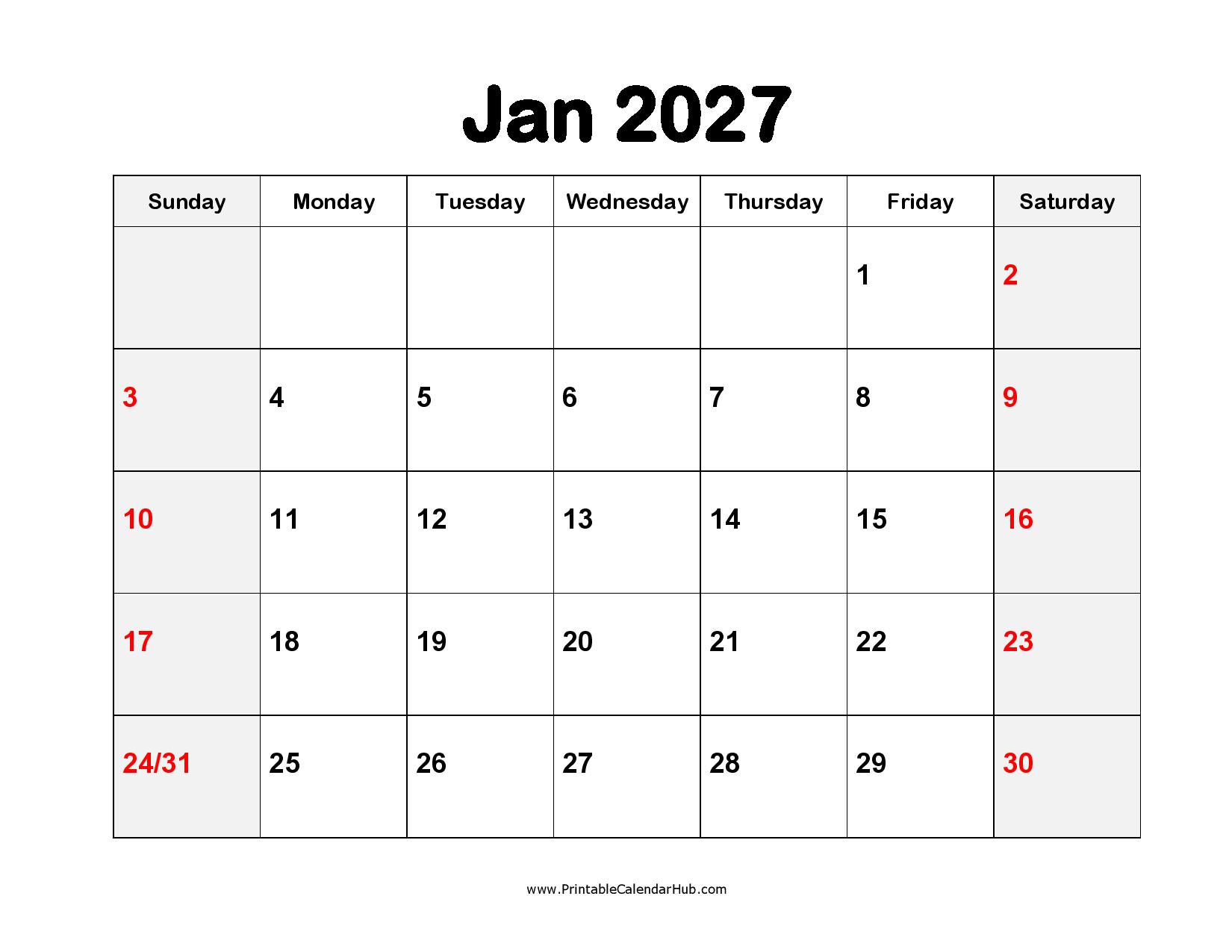 Printable January 2027 Calendar
